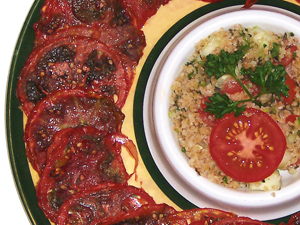 - 10 Roma tomatoes, thinly sliced or 5 slicing tomatoes