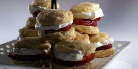 2. Cut the scones in half horizontally. Garnish the bottom halves with strawberries. Add a dollop of whipped cream and cover with the top halves.