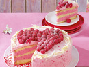 4. Tortenring lösen. Zum Verzieren 75 g Himbeeren mit Vanillezucker pürieren. Sahne mit Sahnefestiger steif schlagen, Püree vorsichtig unterziehen. Torte damit einstreichen. Restliche Himbeeren herzförmig daraufsetzen. Kuvertüre in feine Späne hobeln, Torte damit verzieren.