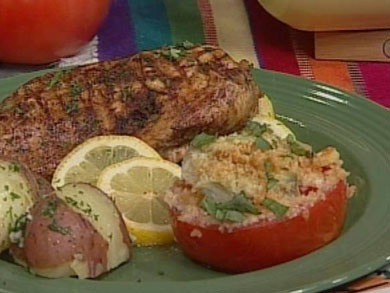 Arrange tomato halves cut-side up over bottom of baking dish. Place artichoke hearts evenly over tomato halves. Pour dressing over top; set aside.