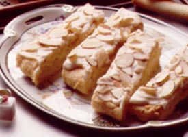 TOP: Heat to boil 1/2 cup butter, 1 cup water, 1 tsp. almond extract. Remove from heat and mix in 1 cup flour; beat in 3 eggs one at a time. Spread over crust. Bake 60 minutes at 350 degrees. Frost when cool with vanilla frosting and sprinkle with chopped almonds.