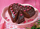 3. Zum Verzieren Kuvertüre hacken und schmelzen. Butter und Sahne erwärmen, unter die Kuvertüre rühren, bis sie glänzt. Die Glasur mit einer Palette auf dem Kuchen verstreichen. Schokoladenherz mit Mini-Herzchen verzieren. Ca. 1 Stunde fest werden lassen.