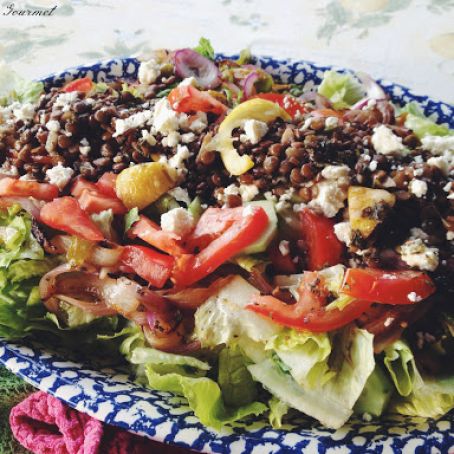 Plate the Romaine along with all the fixings for the salad and the seasonings. Top the salad with the lentils and crumbled feta cheese. Drizzle the dressing over the salad.