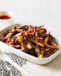 Heat a large griddle until very hot. Add the steak and onion along with the pickled jalapeños and stir-fry over high heat until the meat and onion are cooked through and lightly charred, 3 to 4 minutes. Add the tomato and cook until softened and beginning to char, about 1 minute. Add the french fries and cilantro and flip with a spatula to combine. Serve right away with hot sauce.