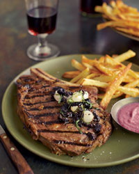 Preheat a grill pan or light a grill. Grill the steaks over moderate heat, turning once or twice, until lightly charred, about 7 minutes for medium-rare meat. Let the steaks rest for 5 minutes, then serve with the onion sauce and pickled onion relish.