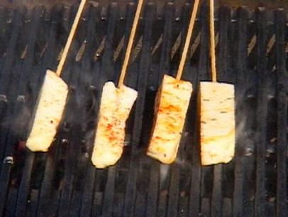 Cut 1 pound halloumi into 1 inch pieces. Toss with 2 Tbsp each olive oil, red wine vinegar and lemon juice and 1 tsp each dried oregano and red pepper flakes. Thread onto 6 inch skewers. Grill on oiled grates over medium-high heat, turning, until softened, about 4 minutes.