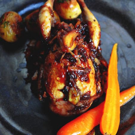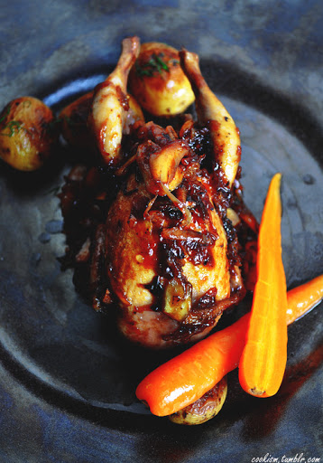 Quails with Brandy Hosin Glaze & Fondant Baby Potatoes