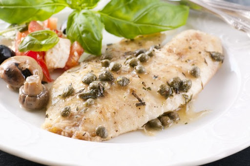 Heat the olive oil in a large saute pan over medium-high heat. While the pan is heating, blot the fish dry with paper towels and season with salt and pepper. Dredge in the flour, shaking off any excess. Saute the fish in the oil until just cooked through, about 4 minutes, flipping halfway through. Remove the fish to a platter. Deglaze the pan with the white wine, whisking for about 1 minute. Add the lemon juice and capers and stir. Add the butter and stir or whisk to incorporate to bring the sauce together. Pour onto the fish and garnish with the chopped parsley.