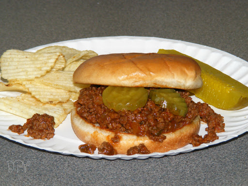 Ground beef, onion, and bell pepper are simmered down in a slightly sweet, tangy sauce until thick then served on buttered and toasted hamburger buns.