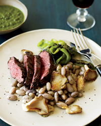 Slice the steak across the grain and serve with the cranberry beans, mushrooms, grilled peppers and charmoula.