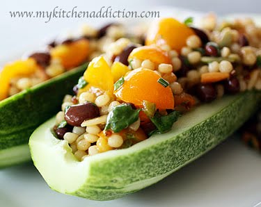 The salad is delicious served in edible cucumber “bowls”… Simply halve the cucumbers lengthwise and scoop out the seeds using a fork. Pile the salad on top and enjoy!