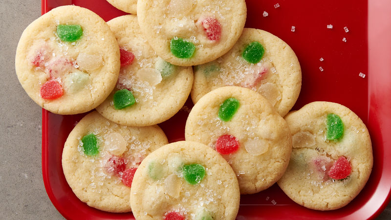 Shape dough into 40 (1 1/4-inch) balls. Place 2 inches apart on ungreased large cookie sheets; flatten each ball to 1 1/2-inch circle. On each dough round, sprinkle sugar and place 3 quartered gumdrops.