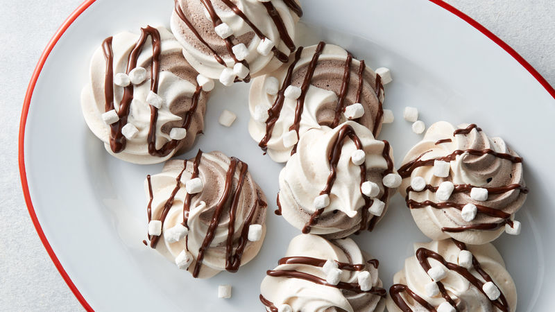 In small bowl, place 2 cups of the meringue. Sprinkle cocoa through fine mesh strainer over top; fold cocoa into mixture. Place large piping bag fitted with large star piping tip on its side. Using large icing spatula, spoon half of white meringue so it covers one half of the length of inside of piping bag. Carefully spoon half of the cocoa meringue on top of the white in bag. On cookie sheet, pipe into 2-inch circles. Repeat filling piping bag and piping with remaining meringues.