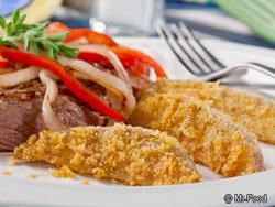 Place melted butter in shallow dish. In another shallow dish, combine remaining ingredients except potatoes; mix well.