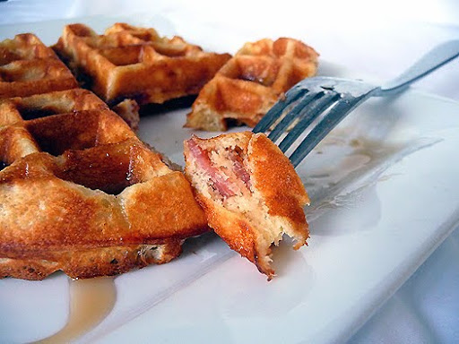 In a large bowl combine flour, baking powder, baking soda, salt and brown sugar. Whisk to blend. In a medium bowl, whisk together eggs, oil, buttermilk and vanilla extract. Add the wet ingredients to the dry ingredients and fold. Once almost fully incorporated, add the bacon and stir. Mix only until most of the dry ingredients are moistened in the batter; like pancakes, it’s good to have a lumpy batter.