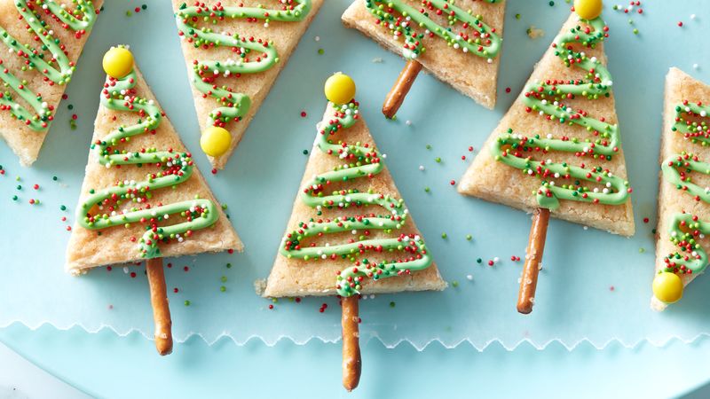 Break pretzel sticks in half. Insert pretzel half in short end of each triangle. In small bowl, tint frosting with green food color to desired color. Spoon frosting into small resealable food-storage plastic bag; partially seal bag. Cut off tiny corner of bag. Squeeze bag to pipe frosting over bars. Sprinkle with sprinkles. Place 1 chocolate candy on top of each triangle. Store in airtight container.