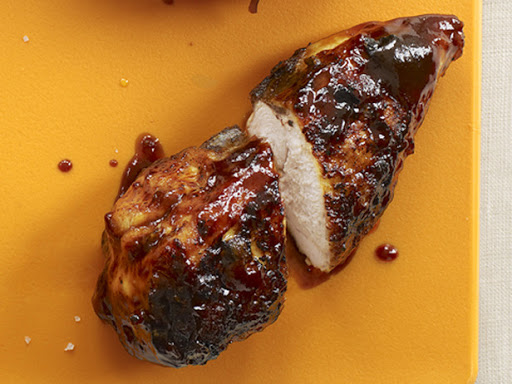 Simmer 1 cup ketchup, 1/2 cup cider vinegar, 3 tablespoons each molasses and brown sugar, 1 tablespoon each dried mustard and soy sauce, 2 teaspoons Worcestershire sauce, 1 cup water, and kosher salt and pepper to taste until thickened, about 30 minutes. Preheat a grill to medium-high on one side. Season 4 bone-in, skin-on chicken breast halves with salt and pepper. Grill over direct heat until golden and crisp on both sides, about 5 minutes. Transfer to a bowl and toss with 1 cup of the sauce. Place on the cooler side of the grill; cover and cook, basting once, until the meat is glazed and reaches 165, 25 to 30 minutes.