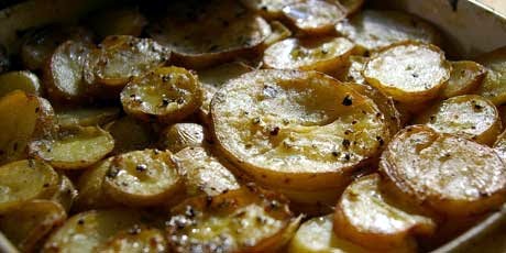 Heat the oven to 300°F/150°C. Melt half the butter with the olive oil in a sauté pan and gently fry the onions until soft and lightly golden, about 15 minutes. Spread half in the bottom of a casserole. Lay a layer of sliced potatoes on top, season with salt and pepper, and scatter with thyme (to taste). Build another layer of onions, then a final one of potatoes, and finally pour over stock. Cover with foil and bake until all the liquid has been absorbed, 2 to 3 hours, removing the foil for the last hour if you like a crisp top.