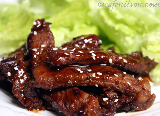 What is the difference between the Korean dishes Kalbi and Bulgogi? One friend told me that the marinade used is the same but the cut of beef used is what distinguishes one from the other. Apparently, Kalbi usually means short ribs while Bulgogi uses thinly sliced beef. Well, I am calling this Korean Barbecue Beef. I used a cut of beef that is a little bit on the chewy side (untrimmed tri-tip) which I cut into 1 inch slices. I soaked the beef slices in spicy soy sesame marinade for 2 days. Today I took out one cut and sliced it thinly before quickly cooking it in a non-stick pan.You can call it whatever you want. I’ll just call it delicious! Especially when served with steamed rice or salad.