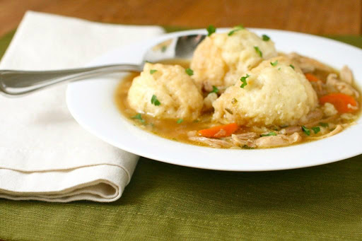 In large bowl, combine biscuit mix and milk. Drop by tablespoonfuls into simmering broth. Cover and simmer 10 to 15 minutes, or until toothpick inserted into dumpling comes out clean. Do not lift cover while simmering! Ladle in to bowls to serve immediately.