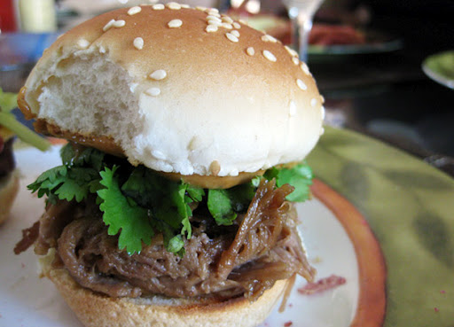 For the preparation, simply grill the little buns, add the pork, the fresh coriander and the ginger mayonnaise.
