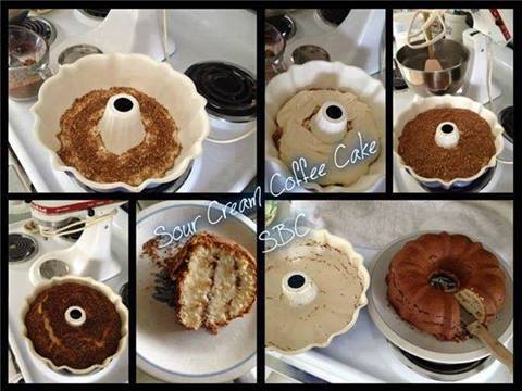 Grease & flour 9” bundt cake pan. Recipe calls to spoon in half of the mix, but I do it in 3rs because I really like the topping put in the center in a couple places… So, spoon 1/3 or ½ of the mix (dough) in the pan & spread it somewhat evenly around. Sprinkle some of the nut topping on, enough to cover the dough. Spoon in another 3rd (or the rest) of the dough, spread evenly, then more of the nut topping. Finally spoon in the rest of the dough and spread around evenly (if doing 3rds) and put remainder of topping on.