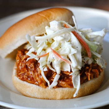 Cook on low for 6 hours (crockpot temperatures vary, yours may take more time), stirring a couple of times throughout if desired. After 6 hours, shred the chicken and add it back to the sauce in the crockpot. Toss chicken with the sauce and let sit for 15 minutes so it can absorb some of the sauce. Serve on hamburger buns topped with coleslaw.