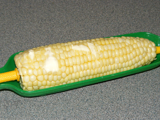 Remove from microwave with an oven mitt. With a sharp knife, cut off the stalk end of corn. Using the oven mitt, hold the corn upright, squeeze downward, pushing it out the cut end. Voila, perfectly cooked ready-to-eat corn, with NO silks to remove! Pass the butter, please!
