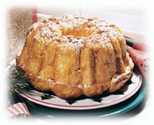 Mix other ingredients in a bowl except powdered sugar. Dip rolls in mixture and place evenly in bundt pan sprayed with non-stick cooking spray.