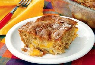Preheat oven to 350. Grease and flour a 9X13 pan and set aside. In a large mixing bowl, beat the butter and brown sugar with an electric mixer until light and fluffy. Beat in the eggs and vanilla extract. In a medium bowl, stir together the flour, baking soda and salt. Gradually add to the creamed mixture alternating with the buttermilk, beating until smooth after each addition. Stir in the peaches by hand. Pour the batter into the pan. In a small bowl combine the sugar and cinnamon. Sprinkle over the batter. Bake at 350 for about 40-45 minutes or until a toothpick inserted near the center comes out clean. Serve warm.