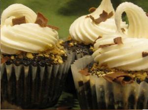 Meanwhile, beat marshmallow creme, butter, sugar, and water together. When cupcakes are completely cool, pipe frosting on cupcakes. Using a vegetable peeler, make chocolate curls with chocolate bar. Sprinkle chocolate curls over frosting.