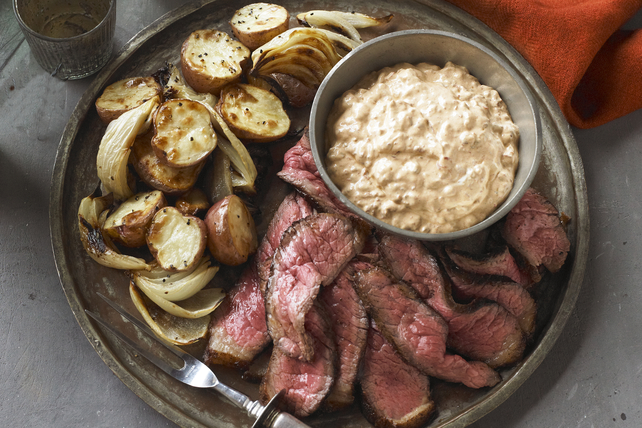 Cut steak across the grain into thin slices. Serve with vegetables and sour cream sauce.