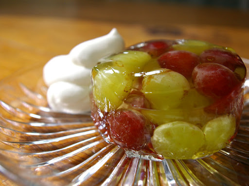 Arrange the grapes in 6 ramekins or tea cups. Pour over the wine mixture. Cover, and chill several hours to set. To serve, run a knife around the edge of the molds and dip the bottoms into hot water for a few seconds, then invert onto serving plates.