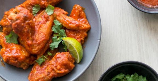 Toss the wings in the Sriracha sauce and garnish with cilantro and lime wedges. Serve warm.