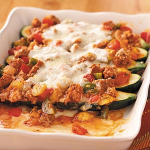 4. Pour over zucchini. Sprinkle with remaining Parmesan. Bake, uncovered, at 350° for 25-30 minutes or until heated through. Yield: 3-4 servings.