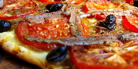 Heat the oven to 400°F/200°C. When the dough is ready, punch it down and roll it out like pizza dough. Lay on a baking sheet. Top with the onions. Lay on the tomato slices in rows. Arrange a lattice of anchovies, and fill spaces with olives. Grind over pepper. Let sit 15 minutes for the dough to rise up again a bit. Bake until the crust is done, about half an hour.