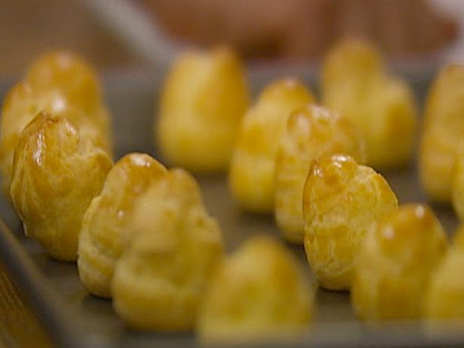 Put 1 1/2 cups/375 ml water, the butter, sugar and salt in a roomy saucepan and bring to a boil. Remove from the heat and add the flour all at once, beating until it forms a ball and pulls away from the sides of the pan. Return the pan to the heat for a minute or two and beat to dry it out a little. (Removing moisture will allow the paste to absorb more egg, which will ultimately make the puffs lighter.)