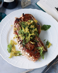 Generously brush the hot lamb chops with the glaze. Sprinkle the chops with the coriander and celery seeds. Coat the fat edge of the chops with the matzo. Scatter the fried mint and celery leaves and the lemon zest over the lamb. Each chop serves two people.