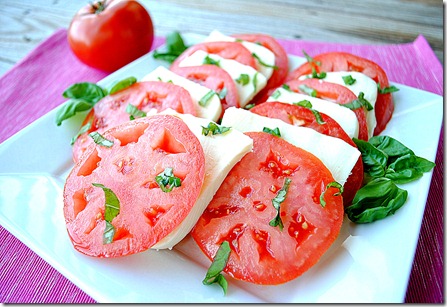 Slice 6 large ripe tomatoes and 1 1/2 1b. fresh mozzarella. Thinly slice 1/2 bunch of fresh basil. On a serving platter, alternate slices of tomatoes and mozzarella. Sprinkle with basil. Season lightly with salt and pepper. Combine olive oil, balsamic vinegar along with a bit of salt and pepper to taste and serve on the side. Enjoy!