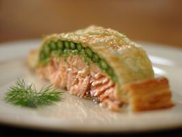 Lay 1 sheet of puff pastry on a damp baking sheet with the long edge facing you. Lay the salmon on the pastry, like a picture in its frame. Sprinkle with salt and pepper. Lay the raw stems of asparagus on top of the salmon, like pencils. Spread the asparagus puree over top.
