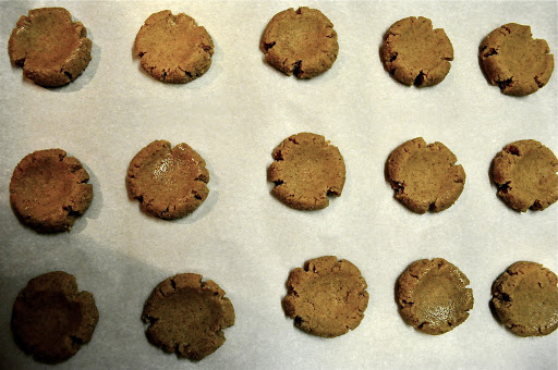 Dough will be fairly soft, but cohesive. Spoon by the scant tablespoon onto ungreased cookie sheets, shaping a bit with the fingers to make little balls. Flatten balls slightly with the back of your spoon or fingers. Keep in mind when placing cookies on sheets that they will spread.
