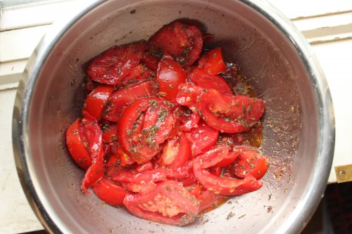 1. Slice tomatoes uniformly and place in medium-sized bowl.