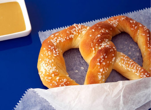 Preheat the oven to 450 degrees and grease a large baking sheet. Punch the dough to deflate it, then turn out onto a lightly floured surface. (If the dough seems tight, cover and let rest until it relaxes.) Divide the dough into 6 pieces. Roll and stretch each piece with the palms of your hands into a 30-inch rope, holding the ends and slapping the middle of the rope on the counter as you stretch. Form each rope into a pretzel shape.