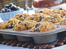 Moist banana-blueberry muffins with oats and flaxseed