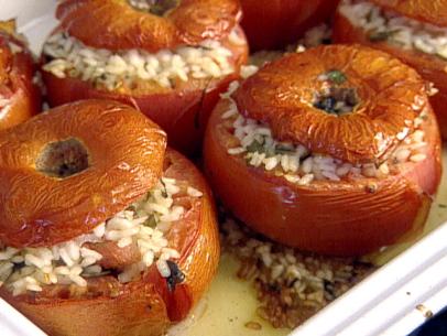 Spoon the rice mixture into the hollowed tomatoes, mounding slightly. Sprinkle leftover stuffing on the bottom of the pan. Drizzle entire dish with olive oil. Place the reserved tomato slices atop the tomatoes. Bake until the rice is heated through, about 20 minutes. Serve hot or at room temperature.