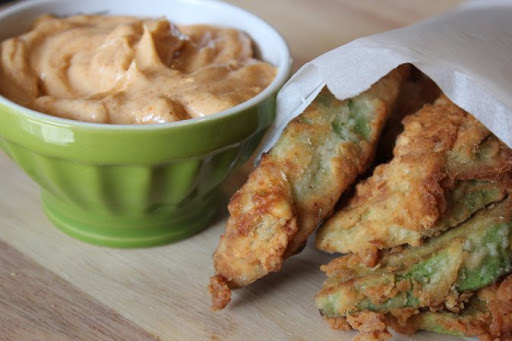 Now, take each slice of Avocado, dip it into the egg mixture and then the flour mixture, then back into the egg mixture then a final dredge through the flour mixture. Set them on a plate until you have them all ready to go into the oil.