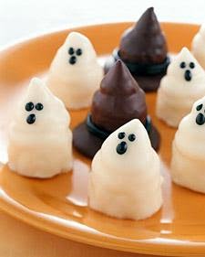 4.Place chocolate in a heatproof bowl set over a pan of barely simmering water; stir chocolate until melted. Transfer to a disposable pastry bag or resealable plastic bag; snip off tip with scissors. Pipe eyes and a mouth onto ghosts.