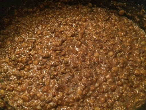 This slowcooker vegan (soy- and TVP-free) taco "meat" is basically this recipe http://healthyslowcooking.com/2013/07/25/slow-cooker-lentil-quinoa-taco-filling/, but with my own seasonings and scaled up to fit a normal-sized slowcooker.