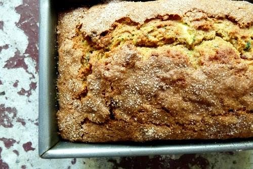 Spray a medium loaf bread pan with non-stick. Pour bread batter into the pan, sprinkle with a good amount of cinnamon and sugar (ratio should be slightly more sugar than cinnamon).