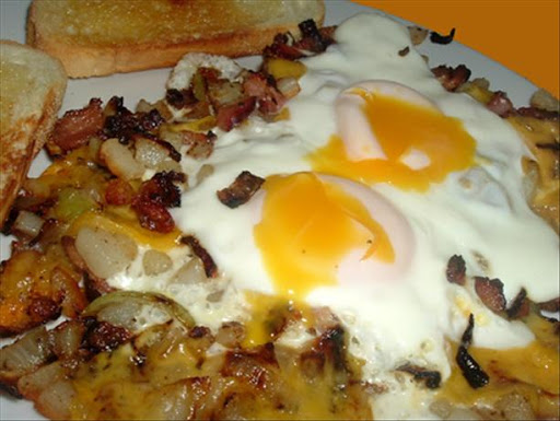 This is a definite do again & again recipe. I cut the recipe back for 1 serving . I did the onions & bacon then browned the hash browns, added the onion bacon back in the pan, sprinkled the cheese over top. Then set it aside until 5 minutes before I wanted to serve the eggs. The potatoes etc formed a lovely crust like base. Delicious Thanks, you are a Crafty Lady posting this enjoyable recipe